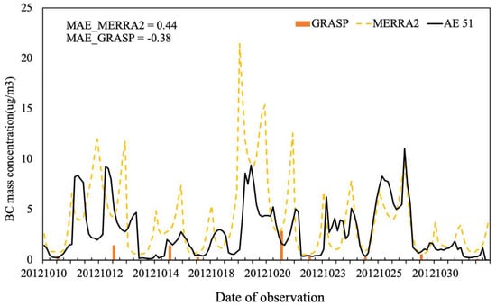 It can be seen that the time series trends of the AE-51 BC measurements, PARASOL/GRASP retrieval, and the MERRA-2-modelled BC at the surface level are in reasonable agreement. In some case, when the BC concentration is low, the PARASOL/GRASP retrieval value is more consistent with the observation, especially in 22 October 2012, where the difference between PARASOL/GRASP retrieval value and AE-51 BC measurements is nearly zero. However, in 22 October 2012, PARASOL/GRASP clearly underestimate BC, which may be caused by the error of the retrieval itself or the assumption of 1 km PBLH to convert columnar BC to near surface []. This phenomenon was also found in Lei et al. []. The MAEs of MERRA-2 and GRASP are 0.44 and −0.38, respectively, with respect to the AE-51 measurements. PARASOL/GRASP BC is slightly underestimated, and MERRA-2 BC is slightly overestimated relative to the observed value.