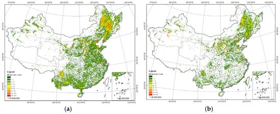 ACF, the NASA Land-SIPS VIIRS 375-m active fire product, is based on 375-m (I-band) data reprocessed by NASA’s Land-SIPS []. Several modified versions of this product based on the MOD14/MYD14 algorithm have been produced []. Since 19 January 2012, the newest ACF data set was updated daily and can be freely obtained from the Fire Information for Resource Management System (FIRMS) []. A total of 4,837,801 ACF data points covering mainland China from the period 19 January 2012 to 31 December 2020 were obtained. The number of ACF data points (total 458,494) per 5 km × 5 km grid cell in 2020 is shown in Figure 2a.