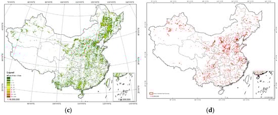L8F, the Landsat-8 thermal anomaly product is based on Landsat-8 data and the normalized burning ratio short-wave (NBRS) algorithm []. The data for the east Asia area can be obtained from the Aerospace Information Research Institute of the Chinese Academy of Sciences []. In this study, 893,106 thermal anomalies were detected in L8F data of mainland China covering the period 1 January 2014 to 31 December 2020. The number of L8F data points (total 82,061) per 5 km × 5 km grid in 2020 is shown in Figure 2c.