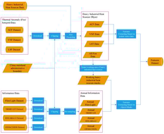 A total of 4340 industrial heat sources were detected in this study. In this section, the extraction of information related to these heat sources and the expression of this information will be described. In order to acquire more information about the heat sources, thermal anomaly data from multiple sources together with the other types of data described above were used. The main steps in the processing of the thermal and other types of data are shown in Figure 4. Feature extraction from the thermal anomaly data and other information about the industrial heat sources was the focus of this data processing.