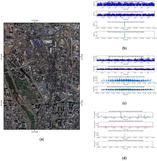 Google Earth image of the Taiyuan Iron and Steel Comply Ltd. (TISCO) together with details of parameter revisions. (a) Google Earth image of TISCO, (b) revised bright_ti4 values of all the ACF at the TISCO site, (c) revised Temp_BB values of all the VNF at the TISCO site, and (d) revised temperatures of all the L8F in TISCO. bright_ti4, Temp_BB, and temperatures were all attribute information of ACF, VNF, and L8F.
