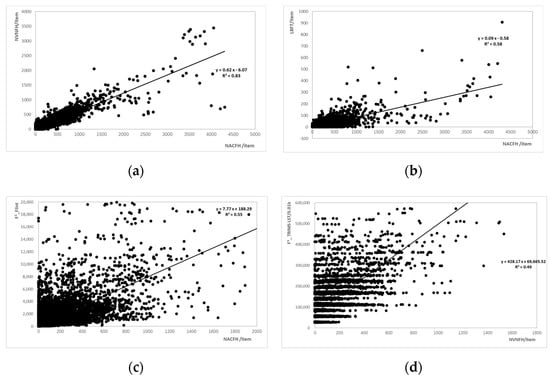 Linear regression between the different features for all the detected industrial heat sources in mainland China: (a) linear regression between NACFH and NVNFH, (b) linear regression between NACFH and NL8FH, (c) linear regression between NACFH and F1 Flint, and (d) linear regression between NVNFH and F1 TRIMS LST.