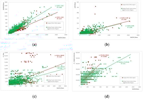 Linear regressions between different features for the complete set of detected industrial heat sources in the Beijing-Tianjin-Hebei Urban Agglomeration (BTH) and the Yangtze River Delta region (YRD): (a) linear regression between the parameters NACFH and NVNFH, (b) linear regression between the parameters NACFH and NL8FH, (c) linear regression between the parameters NACFH and F1 Flint and (d) linear regression between the parameters NVNFH and F1 TRIMS LST.