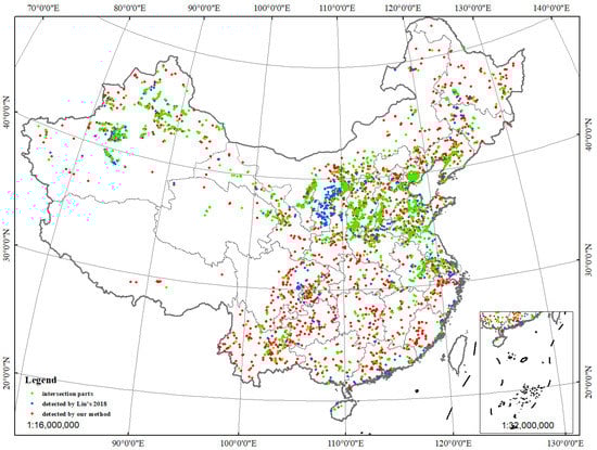 The difference in spatial distribution is shown in Figure 9. A total of 2244 objects (marked with green points in Figure 9) in our results (corresponding to 1773 objects in Liu’s inventory) were spatially matched, with 2096 objects (marked with red points in Figure 9) only detected by our method and 625 objects (marked with blue points in Figure 9) only detected in Liu’s inventory. Those 2096 objects only detected by our method were distributed throughout the whole mainland. Our results found much more industrial heat sources compared with Liu’s results in the south of China. It may be because there are many cloudy and rainy weather conditions in the south of China to influence detection of VNF.