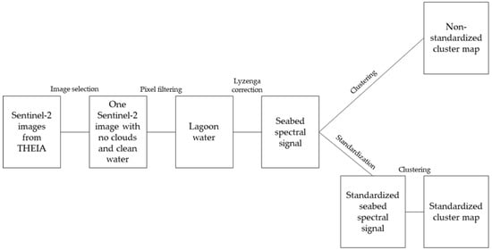Figure 1 provides an overview of the process used for conducting this study. The aim of this study was to cluster the seabed spectral signal in the Voh-Koné-Pouembout (VKP) area of the North-Western lagoon from New Caledonia. For that purpose, a Sentinel-2 image was selected and the Lyzenga correction was applied in order to get the seabed spectral signal by withdrawing the water column contribution [,,]. Then, an unsupervised clustering of the corrected pixels of the image was performed in order to cluster pixels with similar seabed spectral signal (i.e., hereafter referred to as “non-standardized clustering”). In addition, we also attempted to cluster the pixels of the image after standardization of the spectral signal (i.e., hereafter referred to as “standardized clustering”). Finally, the pixels clustered with both the “non-standardized clustering” and “standardized clustering” approaches were used to build seabed color maps that could further be implemented in the satellite-based model using unsupervised classification to depict the spatial distribution of environmental parameters in the investigated shallow coastal waters.