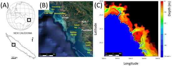 Location (A), Google image (B) and bathymetry map (C) of the Voh-Kone-Pouembout lagoon in New Caledonia. The thin barrier reef, main reef-flats and bays are shown in yellow, while the Oundjo, Kone, Pouembout villages are indicated in white on the Google image. The bathymetry map was built from data in []. Land and pixels corresponding to emerged areas are masked in black.