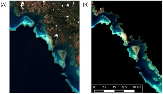 - Hedley, J.; Roelfsema, C.; Brando, V.; Giardino, C.; Kutser, T.; Phinn, S.; Mumby, P.J.; Barrilero, O.; Laporte, J.; Koetz, B. Coral reef applications of Sentinel-2: Coverage, characteristics, bathymetry and benthic mapping with comparison to Landsat 8. Remote Sens. Environ. 2018, 216, 598–614. [Google Scholar] [CrossRef]