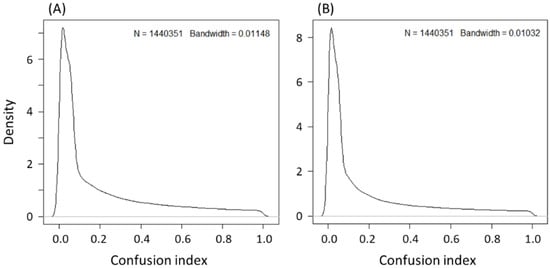 Distribution of the confusion index (CI) for (A) non-standardized data and (B) standardized data.