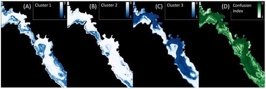 Confidence indicators of the unsupervised clustering with non-standardized data showing membership values for clusters 1 (A), 2 (B) and 3 (C) and confusion index (D) of the whole selected area in the VKP lagoon. A confusion index close to 0 means that only one group k prevails at the pixel, with a high membership value associated with this group k.