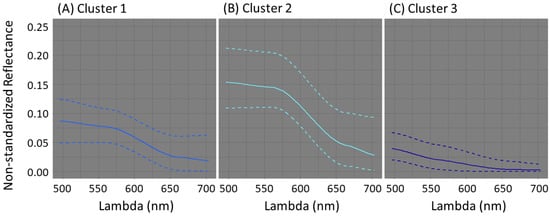 Figure 7 shows the satellite reflectance as a function of the wavelength for the three clusters retrieved from the unsupervised classification with non-standardized data. Mean values are reported in Table 3. Cluster 2 shows the highest non-standardized reflectance values, which indicates that pixels within this cluster have the highest reflectivity on the selected image (Figure 7B). Cluster 1 shows medium non-standardized reflectance (Figure 7A) and cluster 3 shows the lowest values (Figure 7C; Table 3). The pixels included in this cluster are thus expected to be the darkest on the selected image.