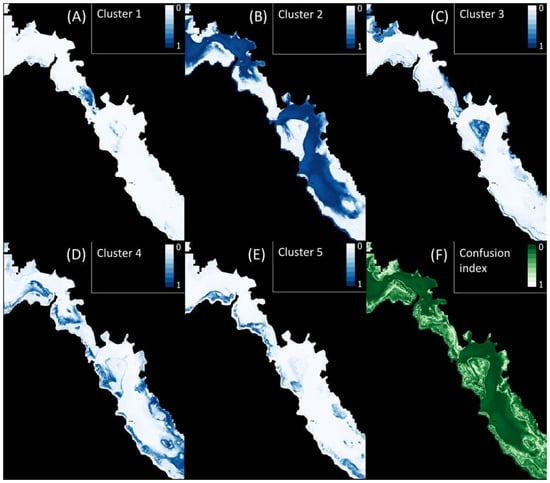 Confidence indicators of the unsupervised clustering with standardized data showing membership values for clusters 1 (A), 2 (B), 3 (C), 4 (D) and 5 (E) and confusion index (F) of the whole selected area in the VKP lagoon. A confusion index close to 0 means that only one group k prevails at the pixel, with a high membership value associated with this group k.