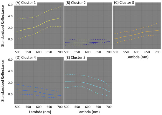 Mean spectra with 90% envelope of standardized reflectance data for (A) clusters 1, (B) 2, (C) 3, (D) 4 and (E) 5. Solid line: mean; dashed line: 5% quantile for lower line and 95% quantile for upper line.