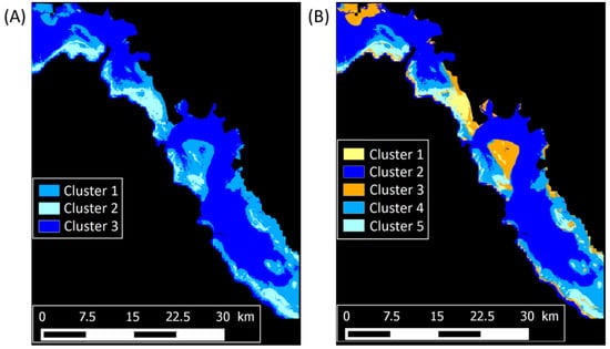 Maps of the three clusters (A) from the unsupervised classification with non-standardized data and of the five clusters (B) retrieved with standardized data, respectively, in the VKP lagoon.