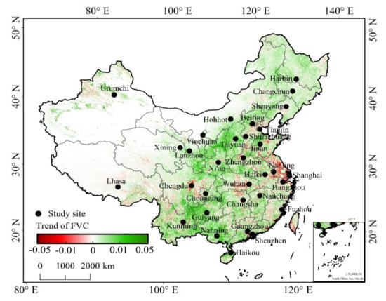 Urbanization explained 10.6% of the variation in vegetation dynamics, which indicated that the indirect effects generated by urban expansion should not be ignored. We further confirmed that urbanization could exert both positive and negative impacts on vegetation. We found that the vegetation coverage in 21 of 32 cities showed a decreasing trend by analyzing the changes in FVC in China’s major cities. This result is also reflected in relevant studies [35]. However, an increasing trend in vegetation was detected in recent years in several cities. The difference might be explained by the changes during the urban development period [62]. Cities in the early stage of development might increase impervious surfaces to support city development at the cost of reducing vegetation coverage [60]. With the increased demands for better living conditions, more developed cities might increase urban vegetation [63].