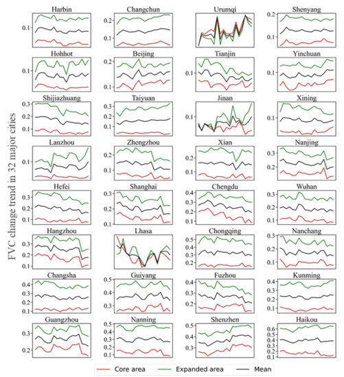 For different cities, the FVC changes can be divided into two categories: FVC changes that differed greatly between the core area and the expansion area, and FVC changes that showed limited differences between the core area and the expansion area. Among the 32 cities studied, similar FVC changes between the core area and expansion area were observed in Urumqi, Beijing, Lanzhou in Northern China, Shenzhen in Southern China, and other cities, and they were mainly manifested by a similar slope of FVC change in spatial distribution; whereas great differences in FVC changes between the core area and expansion area were observed in Southern China, Shanghai, Hangzhou, Chengdu, Fuzhou, Changsha, Chongqing, Nanning, Haikou, and other cities, and they manifested as unchanged growth, an increasing trend in the core area vegetation or a decreasing trend in the expansion area vegetation coverage (Figure 4).