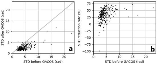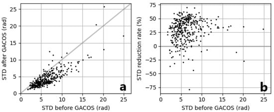 Correlation diagram showing standard deviation: (a), of unwrapped phases before and after the GACOS corrections and their reduction rates; (b), for descending track 80. The grey line denotes a 1:1. The STD decreased from 4.36 rad to 2.61 rad on average with a mean reduction rate 36.29%.