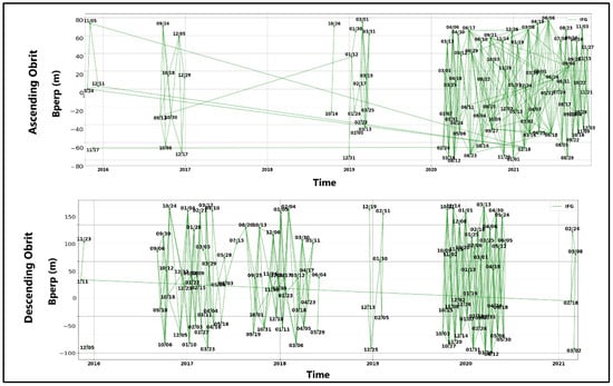 After the tropospheric correction, we performed the quality check function of LiCSBAS. Statistics such as average phase coherence (we applied a 0.3 threshold) and percentage of genuine unwrapped pixels are used to identify bad data. We also performed the network refinement by interferometric loop closure [] and removed 100 interferograms (95 ascending and 5 descending orbit) from further processing. Unwrapped data may contain unwrapping mistakes, which can result in serious errors in the derived time series and should be eliminated or addressed prior to use. Moreover, after the quality checks, we applied the small baseline (SB) inversion on the network of interferograms (Figure 4). The least-squares approach was then used to get the mean displacement velocity (LOS) from the cumulative displacements. We used the NSBAS approach [] to produce a more realistic time series of displacement even with a disconnected network (Figure 4). We selected the SBAS technique because it works well in the vegetated and rural areas such as the mountainous Achaia region, due to the use of distributed scatterers.