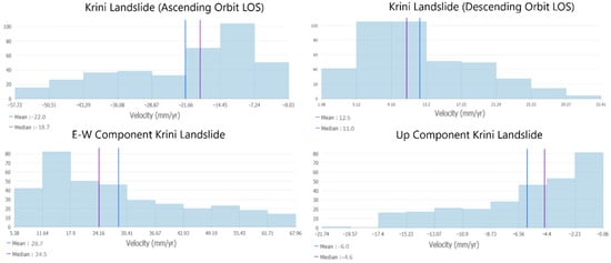 Histograms of LOS/E-W/U-D velocities of active landslides in the village of Krini (Affected area: 4,080,000 m2).