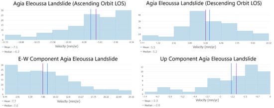 Histograms of LOS/E-W/U-D velocities of active landslides in the Agia Eleoussa area (Affected area: 1,600,000 m2).