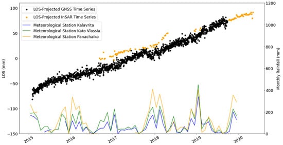 LOS-Projected GNSS time series (KRIN station: black points) and InSAR position time series (orange points: descending orbit) of the pixel which contains the GNSS station. Also, blue, green and orange lines represent the rainfall of the meteorological stations Kalavrita, Kato Vlassia and Panachaiko (see Figure 1 for station localities).