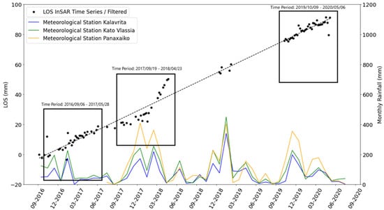 Graph showing LOS position time series for the Krini landslide descending track (080D). Blue, green and orange lines represent the average monthly rainfall of the meteorological stations Kalavrita, Kato Vlassia and Panachaiko, respectively (right axis). The three black boxes represent the time periods what are used for further processing (see Figure 11). The dashed line indicates the linear fit of the InSAR data for the whole period of observations (25 mm/yr).