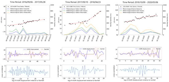 There are many publications concerning rainfall triggers for landslides for the areas of central and southern Europe (e.g., [,,]). The most common parameters used for rainfall threshold definition is intensity (of both antecedent cumulated rainfall and event rainfall) and duration []. The effect of the antecedent rainfall depends heavily on the hydrological conductivity of the landslide mass, and only rainfall events with a large amount of precipitation are considered capable of triggering the increase of deformation rate of deep-seated landslides. The authors of [] noted in their case that the time lag for peak precipitation and peak deformation rate may be up to 20 days, while [] found a 12-day relation. Since proximal rainfall data is available for Achaia (Figure 1), we examined the correlation between the rainfall patterns and the seasonal movement of the Krini landslide because for this landslide the displacement rate is well constrained by the co-located GNSS station (Figure 9 and Figure S10). For this purpose, we used a signal processing method, the cross correlation []. We used this approach to convert our data to signal and compare them, so that we could determine if a time delay (time lag) exists between the maximum peaks of the time series of rainfall and of InSAR, respectively. The cross-correlation technique is used to measure the similarity of two time series as a function of the displacement of one relative to the other and to detect correlations among these two series []. We applied this technique to the daily rainfall dataset, which could play an important role in the movement of a landslide and to the InSAR time series. We used the InSAR time series of the descending track due to the completeness of its dataset during the period 2016–2020 rather than the time series from the ascending track (Figure 4). First, we resampled and interpolated the daily rainfall data to fit it to the time span of the InSAR time series. Because it was complete, we selected the data from the meteorological station Kato Vlassia (Figure 1a) and then performed the correlation for motions (displacements) of the Krini landslide.
