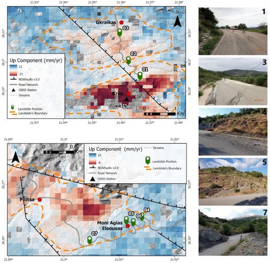 Maps showing U-D component of displacement rate (left panel, 2016–2021). Upper panel map includes the landslide of Krini and Graikas, and the bottom panel map includes the landslides of Pititsa and Agia Eleoussa, respectively. On the right side we provide field photos with numbers corresponding to the green markers on the maps.