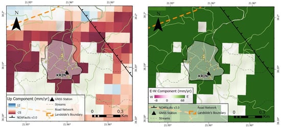 Then, we produced maps of the east-west and up-down components, assuming that the north-south component was neglected due to the track’s geometry of the Sentinel-1 satellite. We found that all active landslides were moving east and downward (subsidence, Figure 6a,b). All the affected areas are located on the east-facing slopes and in the foothills of Panachaiko mountain (Figure 1).