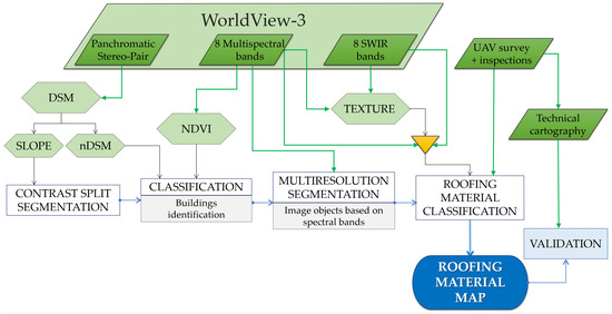 To automatically detect buildings and differentiate them depending on their roofing material, a new multi-level object-based procedure was developed as a process tree, starting from the approach proposed in [37]. The classification was applied to the WorldView-3 imagery and the derived DSM, using eCognition software (version 10.1, Trimble, Munich, Germany). Figure 2 shows the general workflow of the proposed procedure.