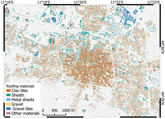 Automatic building detection from remote sensing has been widely debated in the scientific literature and a detailed review is beyond the scope of the present paper. Readers are referred to recent review papers [4,5,6]. Here, only contributions where the classification of roofing materials is considered (alongside the problem of roof detection) are briefly discussed. This problem has been addressed for several purposes, encompassing building inventory for earthquake damage assessment [7], identification of hazardous materials such as asbestos [8,9], and for thermal flux or energy efficiency studies that require proper determination of surface emissivity in a smart city perspective [10,11], among others.