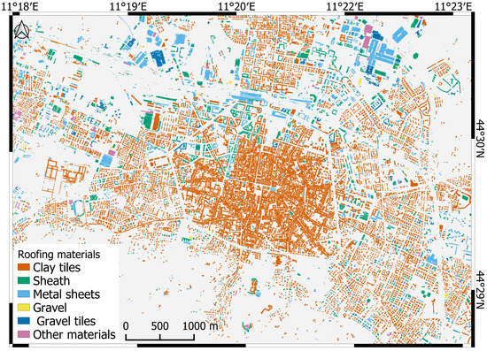 The “Clay tiles” class considers two subclasses: red- and gray-colored tiles. The great majority of buildings of the historic center has the traditional red third or half round ridge clay tiles. The “Sheath” class groups bituminous, slated and reinforced sheaths. Sheets of different alloys and with different coatings are included in the class “Metal sheets”: red, brown, green painted and uncoated metal sheets. Finally, two different classes were considered for the material gravel. “Gravel” refers to flat roof covered by a layer of loose gravel, and “Gravel tiles” refers to concrete tiles with gravel. Examples of roofing material classes are shown in Figure 4.