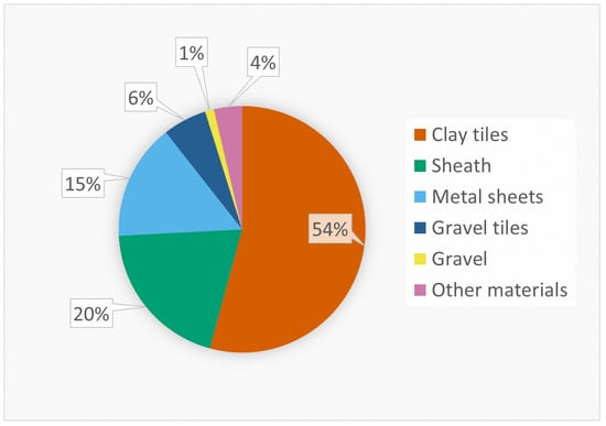 From the final classification map (Figure 6) some statistics about the occurrence of the different materials can be obtained (Figure 7). It is confirmed that the clay tile is the most used material, covering more than half (54%) of buildings in the study area. The other frequent materials are sheath (20%), followed by metals sheets used in the 15% of cases. The remaining roofs are covered by gravel tiles (6%), gravel (1%); finally, the 4% does not fall in any of the considered classes and is labeled as “other materials”.