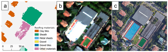 As for the considered classes, the classification included the most used roofing solutions, but took into account also the possible occurrence of rare materials. One example of such a situation is depicted in Figure 9, where the temporary cover of a swimming pool is correctly assigned to the other material class. The shape of the detected object appears irregular, probably as a consequence of the rounded and convex surface of the dome inflatable structure, which is poorly resolved by the photogrammetric DSM.