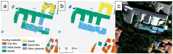 As a consequence, the majority filter has a certain impact on the final map. On the one hand, it strongly improves the results by removing some noise due to the presence of chimneys, HVAC units, and skylights, which produce small objects of different classes. It also removes errors occurring at the edges of the roofs, where some segments sometimes include pixels from the facades or the ground. On the other hand, some disadvantages can arise when the roofs of large buildings are covered by different materials over different wings, but they belong to a single super-object. One example of these positive and negative consequences can be seen in Figure 12, where the gravel roof (yellow) appears cleaned from spurious objects after the majority filter, while one correctly classified metal wing (cyan) of the central building is merged with the dominant sheath cover (green).
