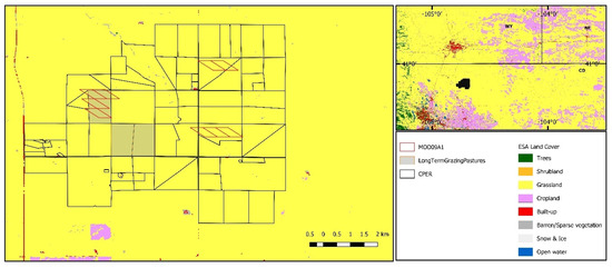Central Plains Experimental Range (CPER) location in north-eastern Colorado, USA. Each long-term grazing intensity paddock represented 130 ha. The MOD9A1 selected pixels represent approximately 25 ha. Land cover was assessed through the world land cover mapping developed by the European Space Agency through Sentinel 1 and 2 data [53]).