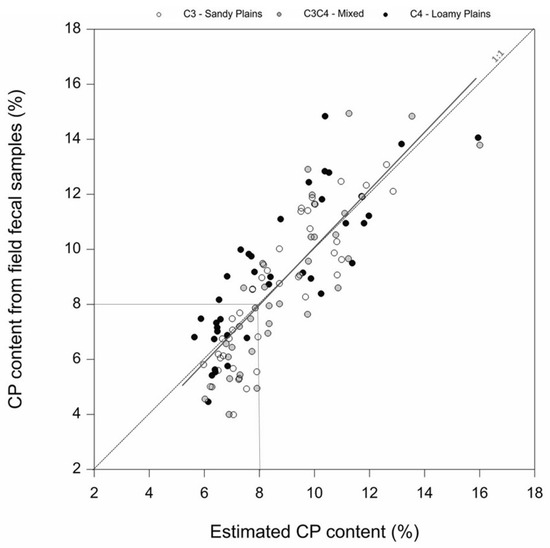 Relation between CP content (%) derived from remotely sensed and the observed CP content. Remotely sensed data were obtained from the MODIS-Terra satellite through the MOD09A1 synthetic product using the green (b4) and red (b1) portions of the spectrum. The continuous line represents the fitted model between the observed and predicted values. The dashed line at 8% CP content represents the threshold for individual intake.