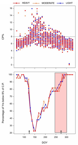 (Top panel): Seasonal variation in CP content remotely estimated through MODIS-TERRA, MOD09A1, during the 2000–2021 period, for 130 ha paddocks with three long-term grazing intensities (light, moderate, and heavy) at the Central Plains Experimental Range in north-eastern Colorado, USA. The dashed line at 8% CP content represents the threshold for individual intake. (Lower panel): Seasonal dynamics of the risk of forage CP content being ≤8%for each of the three grazing intensity treatments. Risk level was assessed as the percentage of years during 2000–2021 where CP content did not reach the threshold value of 8% for the day of year during the grazing season. Arrows on the bottom part represent the traditional start (DOY 135) and end (DOY 275) day that cattle graze on these pastures. The shaded region represents the critical period to end the grazing season.