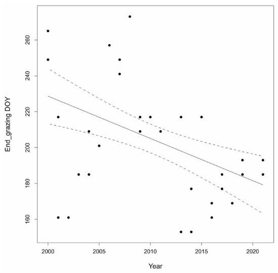 The 8% CP content threshold at the end of the season was reached increasingly earlier across the 2000–2021 period. If ranchers had to end the grazing season based on that date, it would have shortened by more than two days per year (Figure 5. END_grazing DOY = 4941 − 2.356 year; R2: 0.18; p-value < 0.001; n: 60). This relationship indicates that grazing animal intake limitations due to the 8% CP threshold have shifted from late August in 2000 to mid-July by 2021.