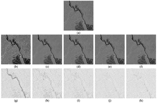 Filtering results for the ALOS Image. (a) The speckled image. (b) The SRAD filtered image. (c–e) are, respectively, the PPB filtered image when T = 4, T = 3, and T = 2. (f) The SAR-BM3D filtered image. (g–k) are the corresponding ratio images of (b–f).