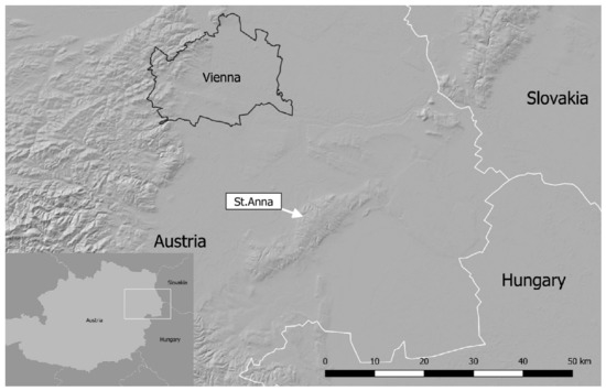 Located some 30 km southeast of Vienna in the shadow of the Leitha Mountains (Leithagebirge) on the border between the Austrian federal states of Lower Austria and Burgenland (Figure 1), St. Anna in der Wüste has been a focus for a methodological research on archaeological ALS for more than a decade [39,40,41,42,43]. Since 2007, the area has been repeatedly documented throughout different seasons, including less favourable periods of the year, as part of the research programme of the Ludwig Boltzmann Institute for Archaeological Prospection and Virtual Archaeology (LBI ArchPro) [44]. This makes it an ideal case study for investigating the impact of canopy density on the detectability of archaeological features in woodland.