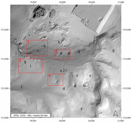 Various types of archaeological features located in the St. Anna area. Hillshade visualisation of data acquired in Spring 2007. The red boxes indicate the location of sample zones fully interpreted archaeologically (1–4). (a) friary complex, (b) Castle of Scharfeneck, (c) former farmhouse, (d) hermit’s cells, (e) prehistoric hillfort, (f) barrows, (g) trackways, (h) quarries, (i) fishponds, (j) field system.