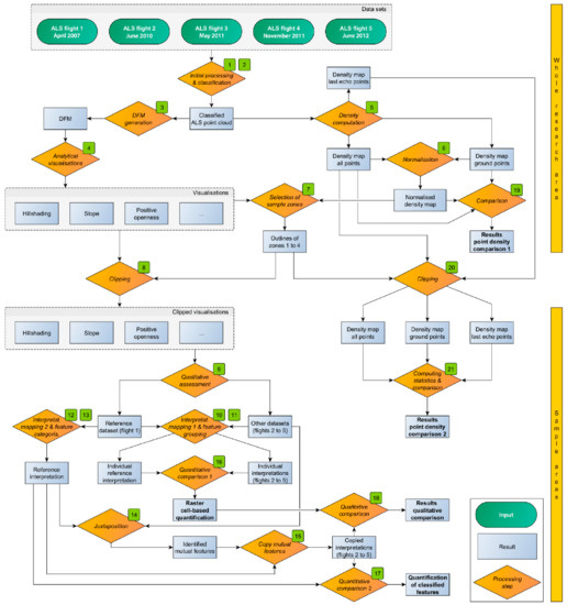 Prior to investigating the impact of leaf-on conditions on the recording of relief features, five ALS datasets were pre-processed. Echo detection, the generation of a 3D point cloud from the scanner (direct geo-referencing of scan data by combining scanner range and deflection angle measurements and trajectory data derived from GNSS and inertial measurement devices), as well as strip adjustment were carried out using the OPALS software [45,46]. This initial processing step and all subsequent operations are depicted in the flowchart of Figure 5.