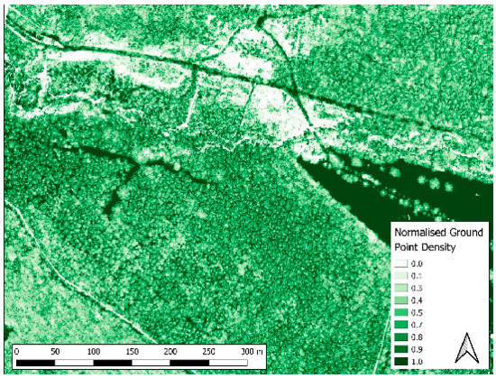 Normalised ground point density map from the data acquired in Spring 2007. Dark tones represent open areas (normalised ground point density = 1), while bright tones indicate dense vegetation.