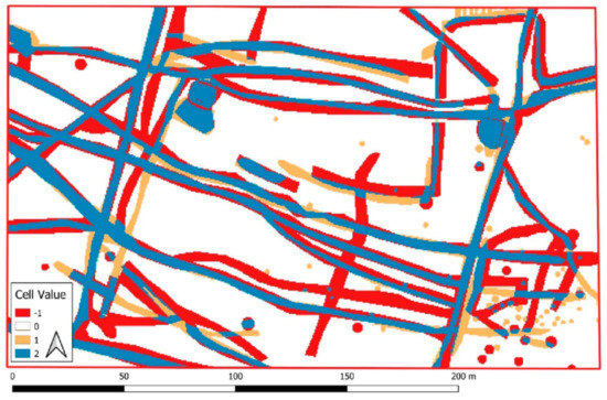 The third example presents a part of the network of hollow ways in Area 3 (Figure 20). While many of the tracks were recorded at the peak of the vegetation season, the shallow features are no longer visible and only deeper incised hollow ways are revealed. The very few hollow ways that are visible in the June 2010 data seem to be much wider than the same features in other datasets. Parallel lines running close to each other seem to form a single, wide path (compare Figure 14) in this low-density data. As a result, many “−1” values were recorded in the raster-based comparison. In addition, several mound-like features occur, resulting from erroneous ground point classification. Such false positives were identified as real features in the “individual interpretation”, and thus also contributed to the high number of “−1” values.