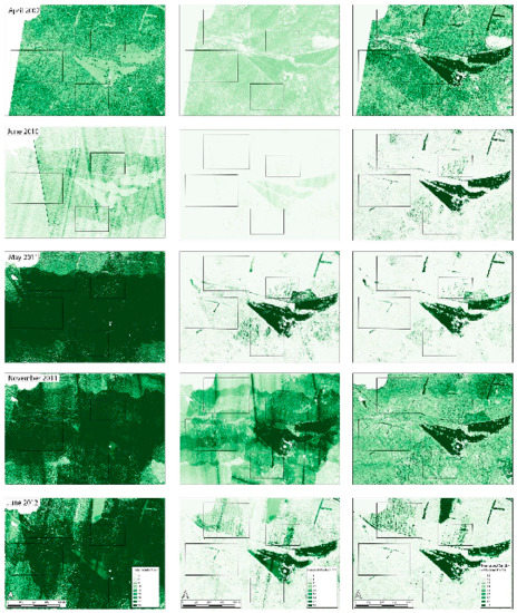The right column of Figure 10 presents maps, scaled from light green (0) to dark green (1), of the normalised ground point density, i.e., the portion of ground points from the total points recorded per m2. Outside the open areas where ground points were usually the only points recorded, the picture is quite different from the other columns. The leaf-off flights (Spring 2007 and November 2011) demonstrate relatively uniform high values, while the other flights are characterized by low ground point percentage in woodland areas and often null values were recorded for densely overgrown areas.