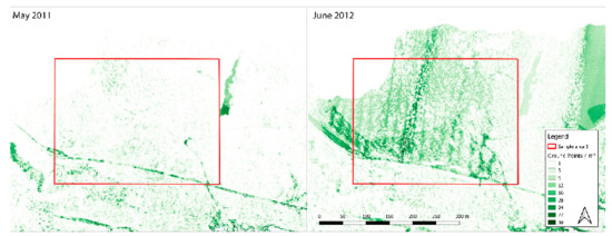 (Left): ratio of ground points and total points per m2 from May 2011 indicating dense vegetation. (Right): the same area from June 2012 shows that due to forest management, north-south-oriented 5 m wide lines of trees had been removed. As a result, more ground points could be collected by ALS in the respective area, which is indicated by the darker green tones.