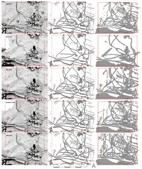 It is worth noting that this approach results from a particular decision made for the purposes of this study and it relies on the availability of a high-quality reference data. Features identified in the 2007 dataset fed the interpretation of subsequent DFMs. If the visualisations of June and July data were interpreted from scratch (cf. “individual interpretation” approach), it is very likely that some features might have been omitted and the number of visible features would have been lower.