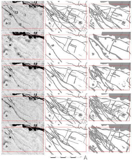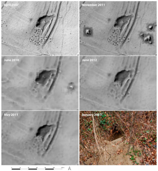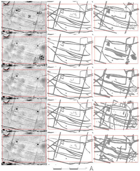 It is evident that the detail of archaeological information decreases with the reduced lidar surface sampling, i.e., a smaller number of ground points recorded. Over 50% of the baseline archaeological features were identified in the high-density data collected in May 2011 and June 2012 through the object-based comparison of the “copied interpretation”. In contrast, the decreased ground point density, caused by leaf-on conditions, impacts the appearance, size and shape of the recorded relief features. Parallel hollow ways and closely spaced pits merged to form large features and produced a high number of values detected either in both rasters or in the non-reference datasets (“2” and “−1” values) in the raster cell-based comparison. At the same time, small and isolated features were obscured, and false positives were produced due to the random distribution of ground points. These false positive features are found in the “individual interpretation” of the leaf-on times and are on the one hand virtually generated objects (mainly discrete features, e.g., Figure 13, May and June, Figure 14, May), on the other hand they can be actual features that have changed appearance (Figure 15, May). In the latter case, linear structures are also affected. Therefore, caution should be exercised when interpreting data sets with low and unevenly distributed ground point density. Nonetheless, it is surprising that over two thirds of the baseline linear archaeological features were identified in both high-density leaf-on datasets, although it has been acknowledged that this success rate would potentially be lower if no reference data were available. The visibility of shallow round structures is the most affected by the change in ground point density.