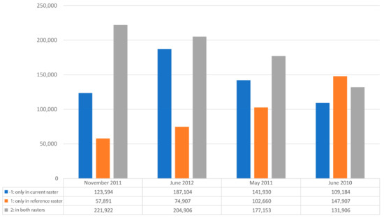 As to be expected, there is a significant coherence between the two leaf-off datasets from April 2007 and November 2011. In this case, the total number of comparison raster cells representing features detected in both rasters (the “2” value) is the highest in every study area. This means that no other data is as similar to the reference dataset as the Autumn 2011 outcome (compare interpretations from Figure 12, Figure 13, Figure 14 and Figure 15). This is obviously because both datasets were collected in a similar phase of vegetation conditions (leaf-off). Anyhow, it seems that in early November 2011, fallen leaves had already deflated after some rainfall and therefore did not fill up microtopographic features [compare 11]. The difference in the mapped morphology of features visible in both datasets, due to uneven distribution of ground points, is the primary reason for the small number of 2007 raster only values (“1” in Figure 16).