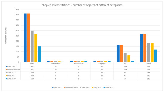 The second, object-by-object, comparison built on the methodology of the “copied interpretation” (17 Figure 5). The number of features visible in each of the investigated datasets was compared for individual feature class and this approach used the five feature classifications.